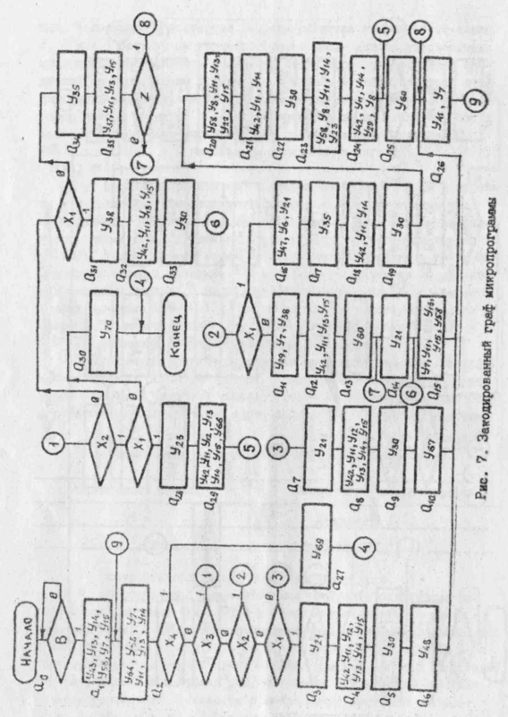 По обобщенной микропрограмме построить закодированный граф микропрограммы (рис. 7) и по нему - управляющий автомат Мура или Мили. В общем случае автомат Мили имеет меньше состояний и для него необходим регистр состояний меньшей разрядности. В лабораторной работе использован восьмиразрядный регистр состояний. Его разрядности достаточно для построения автомата любого типа во всех вариантах. В качестве примера можно построить автомат Мура. В табл. 9 приведены списки переходов автомата. Разметка автомата указана на рис. 7.