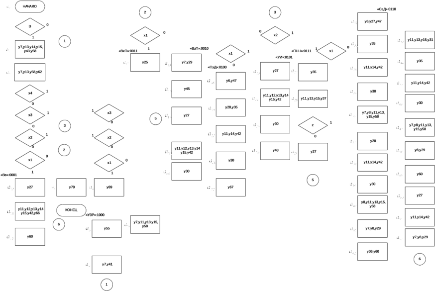 | № пп | Исходное состояние | Код | Следующее состояние | Код | Входные сигналы | Сигналы возбуждения | Выходные сигналы |