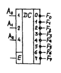 Такой дешифратор называется дешифратором с инверсными выходами. Его условное обозначение приведено на рис. 3.