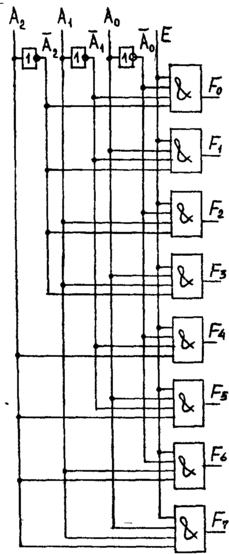 Дешифратором называется комбинационный узел, преобразующий каждый набор двоичных входных сигналов в информационный сигнал на выходе, соответствующем этому набору.