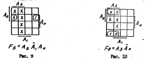 Дешифратор имеет 4 входа и 10 выходов, т.е. является неполным. Неиспользуемые, т.е. запрещенные наборы входных сигналов используются для минимизации системы функций (5). В качестве примера на рис. 9 и 10 приведены карты Вейча, на которые соответственно нанесены функции F5, F8 . Знаками "х" отмечены клетки неиспользуемых наборов переменных: А0,, А1, А2, А3. Минимизируя функции F5 и F6 с учетом неиспользуемых наборов переменных. получим: