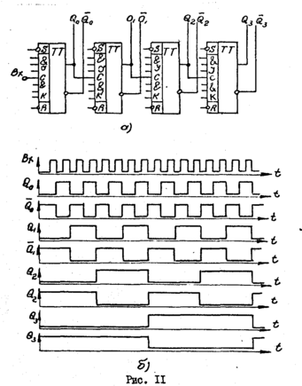 б) снять временные диаграммы сигналов дешифратора, подавая на его адресные входы сигналы Q0, Q1, Q2, Q3, и выходов счетчика (см. рис. II), а на стробирующий вход - импульсы СИ-1 "__", задержанные линией задержки макета.