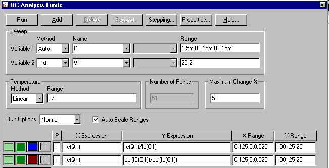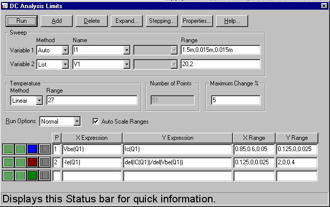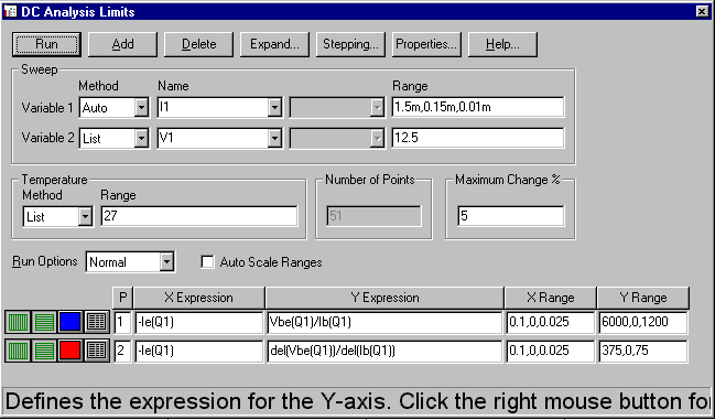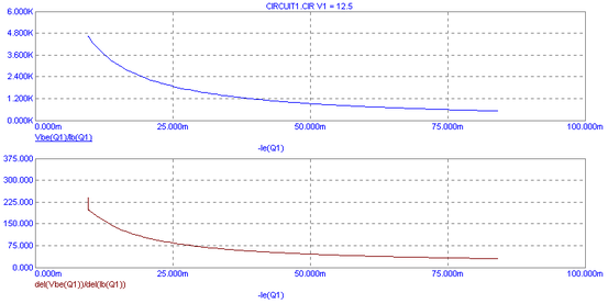 Зависимости входных сопротивлений транзистора по постоянному и переменному току следует получить при изменении тока базы от 0.1*Iб.мах до Iб.мах. Поэтому в окне задания на анализ DC.. надо внести коррекцию на изменение границ первой переменной I1, заказать по оси Х ток эмиттера как Ie(Q1), а по оси Y одной строки отношение напряжения на базе [V(номер узла базы на схеме)] к току базы [Ib(Q1)]. Во второй строке вводится отношение приращений указанных величин с использованием оператора del().