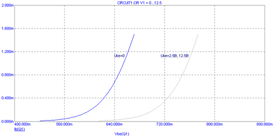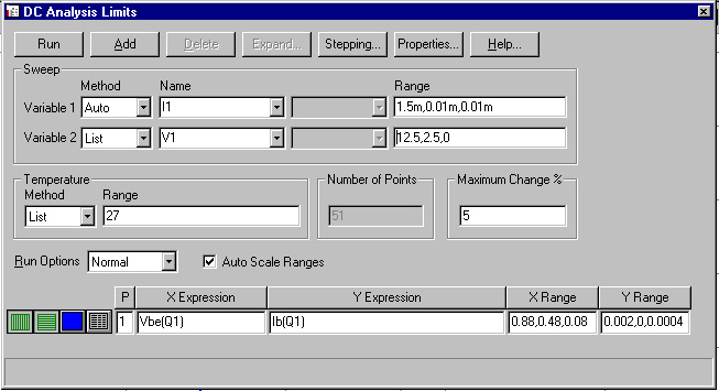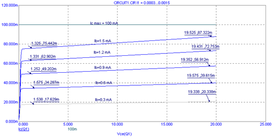При моделировании ВАХ транзистора величина источника тока I1 уточняется, так как параметры модели транзистора отличаются от паспортных данных (в частности, параметр h21э в МС7 жестко задан, в модели на транзистор ему соответствует параметр BV).