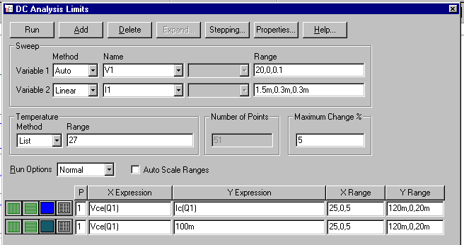 Для получения семейства выходных характеристик используется режим анализа передаточных характеристик (Analysis-DC…). В окне задания параметров анализа выбирается в качестве первой переменной имя источника напряжения V1, а в качестве второй переменной имя источника тока базовой цепи I1. Активизация окна второй переменной происходит только после выбора способа (Method) ее изменения, который необходимо выбрать линейным (Linear). В окнах указания границ изменения переменных (Range) вводятся данные согласно паспорту на прибор: для V1– [максимальное напряжение Uмакс.],0,[шаг], для I1 – [максимальную величину базового тока Iб.макс, при котором ток коллектора максимален Iк.макс (Iб.макс = Iк.макс/h21э)],[ Iб.мин = шагу изменения тока базы],[шаг изменения тока базы]. Рекомендуется выбрать в качестве шага изменения входного тока I1 пятую часть его максимальной величины. При задании границ изменения переменных не следует забывать указание кратности производных величин (мА – m, мкА – u и т.д.). В задании на построение графиков по оси Х указывают напряжение в номере узла, которое соответствует коллектору (по рис. 6 – это V(1)) или Vce(Q1) (в МС7 присвоены выводам транзистора буквы: коллектору – C, эмиттеру – E, базе – B), а по оси Y вводится обозначение тока коллектора с указанием в скобках номера транзистора схемы – Ic(Q1). На выходных характеристиках постройте линию соответствующую максимальному коллекторному току IK.max. Для этого во второй строке по оси Y построения графиков укажите максимально допустимый ток коллектора IK.max., а по оси Х – изменение напряжения на коллекторе Vce(Q1). Первоначально используйте автоматический выбор масштабов построения характеристик. Пример заполнения окна заданий анализа DC.. для получения семейства выходных характеристик транзистора типа КТ315A приведен на рис.2 (по паспорту: РК max =100мВт, UКЭR=25B (при R=10кОм), IК max=100мА, IКБО<=0.6мкА при UКЭ=10В. h21э=50…350).