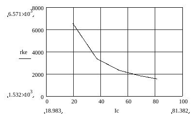 ис. 4. Изменения выходного сопротивления rke [Ом] по переменному току в зависимости от тока коллектора Ic [мА].