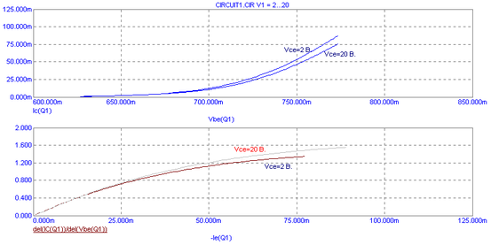Передаточную характеристику транзистора следует получить только для активного режима работы транзистора при напряжениях на коллекторе UКЭ=0.1*UК max и UКЭ=0.5*UК max. Поэтому в окне задания на анализ DC.. в границах изменения второй переменной необходимо внести коррекцию (оставить одно напряжение) и восстанавливаются границы изменения тока базы, как и при получении входных характеристик. В окошке задания построения графика по оси Х вводится напряжение на базе как Ube(Q1), а по оси Y - ток коллектора как Ic(Q1). По передаточной характеристике определяется крутизна транзистора (S=dIк/dUбэ), которая зависит от тока эмиттера Ie транзистора. Для получения данной зависимости следует указать в окне заказа параметров анализа DC.. (DC AnaysisLimits) построение графика под номером 2, у которого по оси Х указать Ie(Q1), а по оси Y – del(Ic(Q1))/del(Vbe(Q1)). Пример оформления заказа параметров анализа приведен на рис. 9, а полученные по нему результаты на рис. 10.