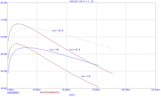Получите семейство статических входных и передаточную характеристики модели заданной марки транзистора. По характеристикам определите диапазон изменения входного сопротивления по переменному току, коэффициентов передачи тока транзистора для постоянного и переменного тока, крутизны от тока эмиттера.