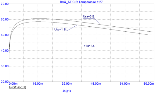 Для определения сопротивления R3 необходимо знать величины коэффициент усиления тока h21Э, для чего лучше воспользоваться результатами первой лабораторной работы. Зависимость коэффициента усиления тока базы h21Э от тока эмиттера для транзистора КТ315А, полученная в среде МС6, показана на рис. 3.