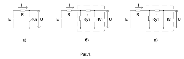 Для коммутации тока в нагрузке используют ключевые элементы, простейшим из которых является механический ключ. Одна из ключевых схем с механическим ключом показана на рис.1, где последовательно соединены источник напряжения Е, резистора R и механический ключ Кл.. В такой схеме необходимо определить ток I в цепи и напряжение U на ключе Кл. в зависимости от его положения (замкнутое или разомкнутое). Неизвестны две величины (I и U), для определения которых необходимо иметь два уравнения.