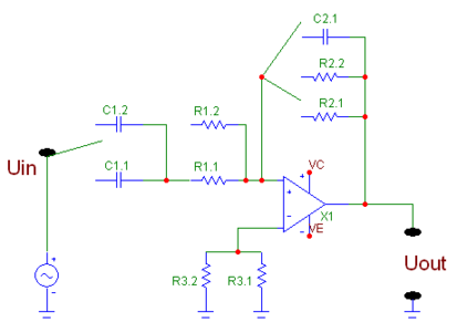 Для схем 1) – 3) конденсатор С1.2 и сопротивление R1.1 образуют фильтр верхних частот, поэтому коэффициент усиления каскада на ОУ в области нижних частот уменьшается и представляется функцией: