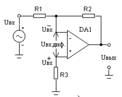 В инвертирующем усилительном каскаде входное напряжение Uвх поступает на инвертирующий вход ОУ с коэффициентом деления mu, определяемым также из законов линейных цепей и равным: