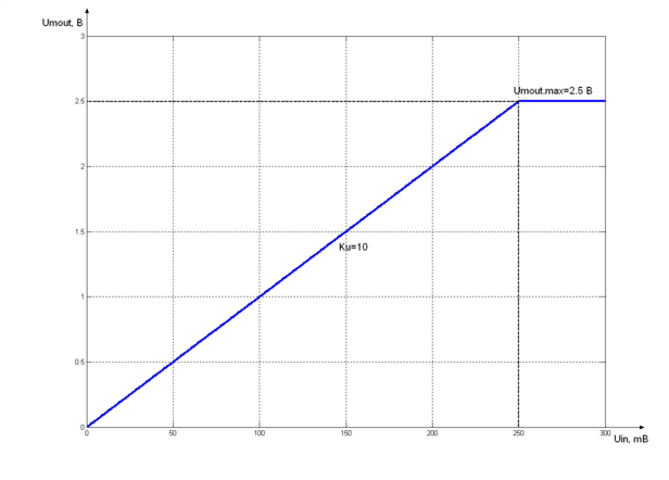 Начиная с определенного уровня входного напряжения, выходное напряжение усилительного каскада на ОУ получает искажения. Уровни входных напряжений, при которых сохраняется линейный режим усиления, определяют по амплитудной характеристике (АХ) усилительного каскада.