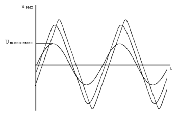 На высоких частотах входного сигнала нарушение линейности АХ усилительного каскада связано с динамическими свойствами используемого ОУ. Специфика схемотехники интегральных ОУ накладывает ограничение на максимальную скорость изменения выходного напряжения vмакс, которая, согласно паспортным данным, равна vмакс=3*105В/с. Предельная амплитуда выходного напряжения Um.вых.макс, начиная с которой в усилительном каскаде наблюдается отклонение от линейного режима работы, выраженное в искажении синусоидального сигнала и преобразование его в треугольный (согласно рис.3), определяется частотой сигнала f и максимальной скоростью vмакс изменения выходного напряжения ОУ: