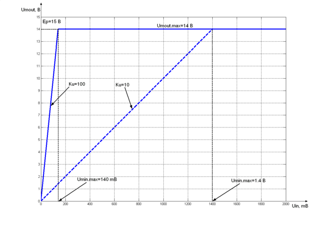 Зная коэффициенты усиления Ки1=100 и Ки2=10 , а также максимальный уровень амплитуды выходного сигнала Uвых.макс=13÷14 В, построим теоретические АХ усилительного каскада на ОУ для 1-го квадранта (см. рис.2).