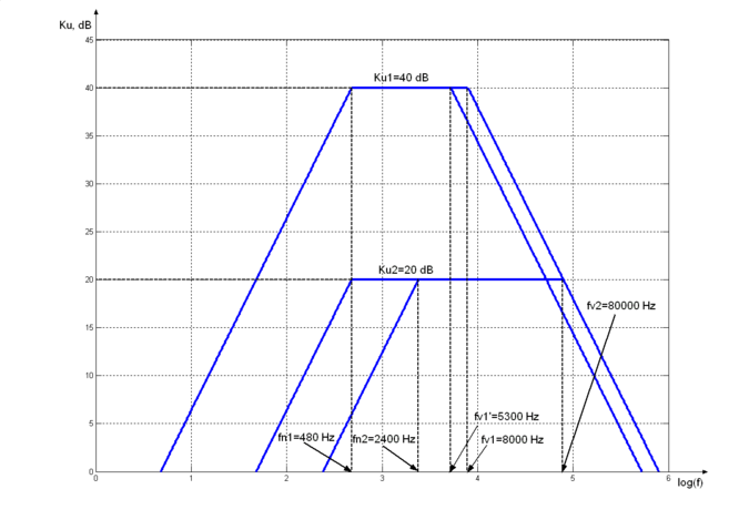 -двумя наклонными с угловыми коэффициентами 20 дБ/дек и -20 дБ/дек для области нижних и верхних частот соответственно; причем точки пересечения наклонных прямых с горизонтальной соответствуют значениям верхних и нижних предельных частот;