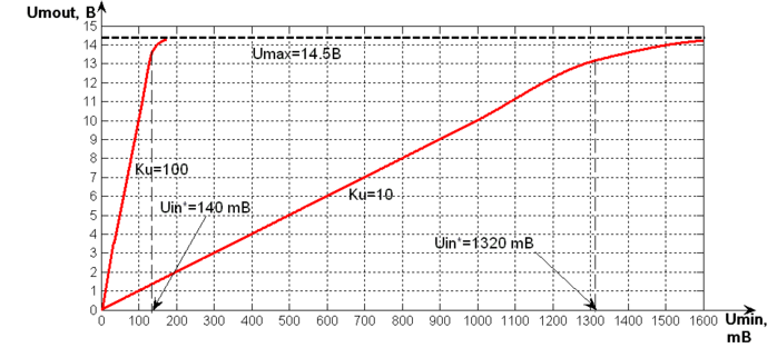Umвых.макс=14.5 В; Umвх.пор=140 мВ и Umвых.пор=1.32 В.