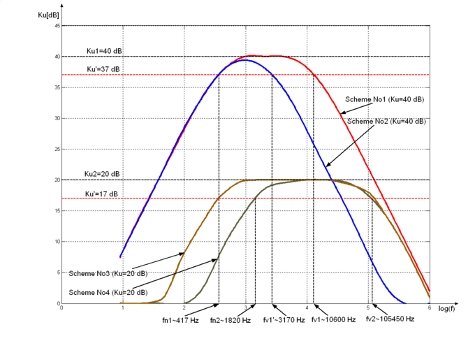 fн1≈417 Гц; fн2≈1820 Гц; fв’1≈3170 Гц; fв1≈10600 Гц; fв2≈105450 Гц;
