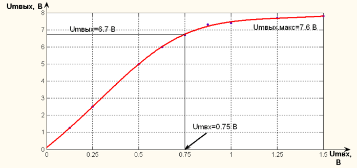 Umвых.макс=7.6 В; Umвх.пор=0.75 мВ; Umвых.пор=6.7 В.