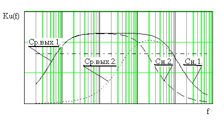 Рис. 5. АЧХ усилительного каскада (Ср.вых1 > Ср.вых2, Сн. 2. > Сн. 1.).