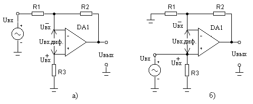 В обеих схемах ОУ охвачен цепью (R1-R2) отрицательной обратной связи (ООС) по напряжению: на инвертирующий вход ОУ возвращается часть (падение напряжения на R1) выходного напряжения Uвых.