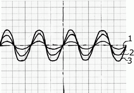 На осциллограмме можно заметить появление нелинейных искажений в выходном сигнале (отклонения от синусоидальности и смещение по временной шкале).