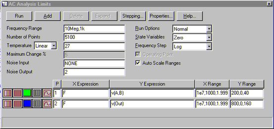 Обратите внимание, что поскольку схема дифференциального усилителя КД118УВ1 имеет широкую полосу усиления, то использован логарифмический закон изменения частоты. Для этого в окне Freguency Step указано Log , а для увеличения точности расчета в активизированном при этом окне Number of Points задано число точек расчета на одной декаде (на рис. 3а – 5100). Для получения более полной информации заказано получения амплитудно-частотной характеристики как дифференциального каскада К118УД1 (V(A,B)), так и на выходе ОУ (V(out)).