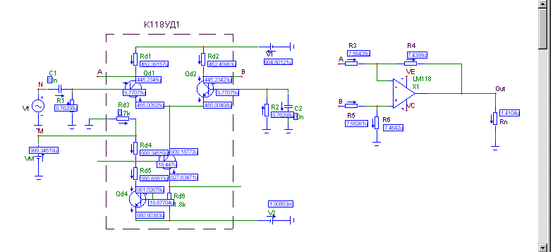 Следует обратить внимание, что на рис. 1. Вместо проведения соединительных проводов с выхода КД118УД1 на вход дифференциального каскада на ОУ Х1 проставлены наименования одноименных узлов (А и В). Данный способ соединения одноименных узлов разрешен в МС7.