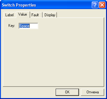 ключ (Switch) – переключатель типа однополюсного тумблера, управляемого нажатием назначенной клавиши клавиатуры (по умолчанию клавиши Space – пробел). Имя клавиши устанавливается в диалоговом окне на рис. 1. Находится на панели инструментов Basic.