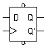 В D-триггере помимо тактового входа имеется только один вход D и установочные входы S / Set / (вверху) и R / Reset / (внизу). В D-триггере Qn+1=D, т. е. триггер запоминает состояние на входе D в момент тактового импульса и хранит его до следующего тактового импульса. Поэтому D-триггер является элементом памяти, он находит широкое применение, в том числе в регистрах. Переключение D-триггера происходит при изменении импульсов C от 0 к 1, т. е. на фронте тактового импульса. Частью D-триггера является асинхронный RS-триггер.