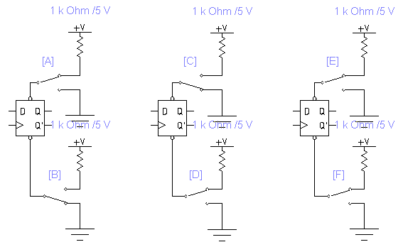 Рис. 2. Положения переключателей для установки триггера в состояние Q=0 (слева), Q=1 (в центре) и Qn+1=Qn / при этом состояние триггера не изменяется / (справа). Пояснения см. в тексте.
