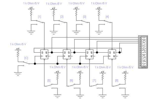 Рис. 4. Вариант схемы для наблюдения сигналов на каждом из четырех разрядов регистра.