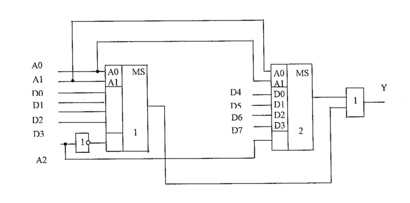 Рассмотрим построение 8-канального мультиплексора на основе 4-канального стробируемого мультиплексора. Для получения 8-канального мультиплексора требуется два 4-канальных стробируемых мультиплексора. Мультиплексоры 1 и 2 выполняют логические функции: