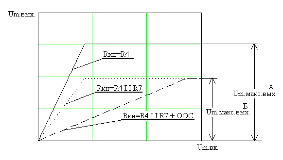 Отметим, что при расположении точки покоя на нижней половине нагрузочной прямой максимальная амплитуда входного напряжения не зависит от величины нагрузки каскада Rкн (с уменьшением Rкн уменьшаются Ku и Um.макс.вых. в одинаковое число раз). Введение же в каскад ООС увеличивает максимальную амплитуду входного напряжения, хотя при этом уменьшается коэффициент усиления Ku.