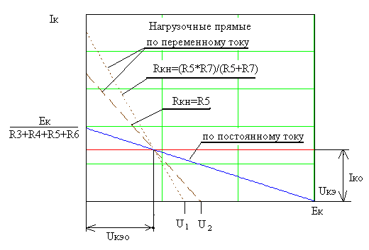 Рис. 3. Нагрузочные прямые усилительного каскада по схеме ОЭ.