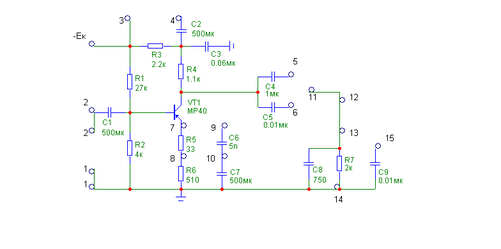 Лабораторный макет позволяет провести экспериментальные исследования характеристик усилительного каскада, собранного по схеме ОЭ. Усилительный каскад может быть собран как с частотной, так и без частотной коррекции. Частотная коррекция АЧХ усилительного каскада в области нижних частот будет наблюдаться при использовании частотозависимой коллекторной нагрузки R3 – C4 – R4, для чего клеммы 3 – 4 должны быть разомкнуты. Для исключения низкочастотной коррекции замыкают клеммы 3 – 4, при этом элементы R3 и С3 выполняют роль фильтра в цепи питания каскада. Для введения в каскад высокочастотной коррекции АЧХ предназначены элементы R5 – C6, при этом в эмиттерной цепи замыкают клеммы 7 – 9 и 8 – 9. При исследовании усилительного каскада без высокочастотной коррекции замыкают клеммы 7 – 10 или 8 – 10. При замкнутых клеммах 8 – 10 в каскаде на резисторе R5 образуется отрицательная обратная связь (ООС) для усиливаемого сигнала. Наборы разделительных конденсаторов (С3 и С4) и конденсаторов нагрузки (С8 и С9) предназначены для определения их влияния на АЧХ усилительного каскада. Напряжение питания усилительного каскада подводится от стандартного лабораторного ниточника напряжений к клеммам –Ек – 1 (Ек=15 В.).