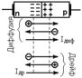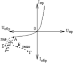 6. ЭДП. ВАХ ЭДП. Рассм. монокр. п/п с резкой границей м/у р и n областями. Предп., что в эл. и дыр. обл. конц. Осн. нос. заряда одинаковы по всему объему и равны соотв. nn и рp. Осн. нос. в п/п n-типа явл-ся e-ны ,а неосн. – дыр., в п/п р-типа наоборот. Обозначим конц. неосн носителей nр и рn.При изг. п/п приборов примеси вводят в таком кол-ве чтобы осн. носителей было на 2-3 порядка больше неосн. (рр>>np; nn>>pn). Граница p и n обл. наз. ЭДП. Т.к. конц. осн. нос. намного выше конц. неосн., то на ЭДП созд-ся градиент конц. е-нов и дыр. В рез. возн. диф. ток I (диф. е в р-область и дырок в n-обл-асть). В равновесном сост., т.е. при отсутствии внеш. ист. эл. поля появл-е диф. тока нарушается нейтральность обл. п/п. На гран. n-области образуется неподвиж пол. заряд ионизированных доноров за счет ухода е из n-обл , а на границе р-обл отр. заряд ионизированных акцепторов. В рез-те в переходн слое обр-ся эл. поле Е, создающ дрейфовый ток Iдр обр. напр. При отсутствии внеш. поля м/у двумя областями п/п уст-ся такая разность пот., при кот. ссуммарн ток ч/з переход = 0. Эта разн. потенц. наз. константной разностьюю потенциалов φк=φ+ln(pp/pn)=φтln(nn/np); где φт=кТ/q - тепловой потенциал, к=1,37*10-23 Дж/К - пост Больцмана, Т-абс т-ра, q=1,602*10-19 –заряд е. Толщина слоя объемного заряда каждой обл. зав. от конц. носителей в обеих областях. Объ. заряд обуславливает уменьш. концентр носителей в этом слое и уменьш. его проводимости. Если к p-n-перех приложить U, то его большая часть прикл. к ЭДП. При этом, ч/з перех протекает ток, вел-на кот. зав. от вел. и напр. U. U прилож “+” к р-обл, а “-” к n-обл и создающ на ЭДП поле обр. напр. по отн. к соnst разн. пот. наз. прямым напряж. | Ток протек. при этом ч/з ЭДП наз. прямым. При прот. полярностити U оно наз-ся обратным ток - обратным током. При подкл. Uпр к ЭДП U на нем уменьш. и стан. = φ. φ= φк-U, где U - прилож напр. Уменьш U на ЭДП приводит к увел. вел. диф. тока, а дрейфовый ток ост. const. Ток ч/з ЭДП перестает = 0, т.е ч/з ЭДП протекает ток, образ осн. носителями. Этот ток наз-ся прямым током и завис от U. Iпр=Iнас(еqU/(kT)-1)=Iнас(еU/φ -1) где Iнас - ток насыщения, опр св-ми п/п и конц. нос. в нем. Записанное ур-е явл. ур-м прямой ветви ВАХ ЭДП: φ=φк+U. Область объемн заряда расшир-ся поэтому диф. ток уменьш., а дрейф. ост. const. Напр. тока изм. и ч/з ЭДП будет протекать обр ток. Iобр=Iнас(е-qU/(kT)-1)=Iнас(е-U/φ-1) Т.к. φт≈0,025 В, то при U > нескольких десятых долей В обр. ток достигает знач-я Iнас и остается const. Идеальная ВАХ ЭДП: |