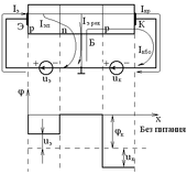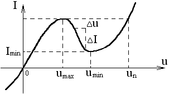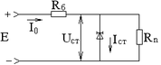 12. П/п стабилитроны и стабисторы. Д-ды в кот исп св-во незначительного изм. обр. напр-я на p-n - пререходе при электр (лавинном или туннельном) пробое наз-ся п/п стабилитроном. ВАХ: Р абочим участком ВАХ п/п. стаб. явл. уч-к 1-2 обр. ветви хар-ки. Осн парам-ми явл: 1) U стабилизац Uст; 2)Min ток. стабилиз Iст min; 3) Мах ток стаб Iст мах; 4) Динамическое или дифференц-е сопротивл-е Rд; Rд хар-ет наклон раб точки учс-тка.(1-2): Rд=d/d(I) ≈∆Uст/∆Iст; 5) Прямое сопр Rпр; Прямое сопр в раб точке А опре по ф-ле: Rн=UaIа 6) Темп. коэф. напр. стаб. (ТКН). ТКН хар-ет измен Ucт в % при изм t-ры окр среды на 10С. Он может сост то 0,0005 до 0,2 %. Напряж стаб. стабилитроне и стабисторе лежит в пределе от 0,7 до 180 В. Min ток стаб Iст min может изм от 10-х долей до 180В. Iст max огр-ся допус-тимой мощностью рассеивания и м/б от 2мА до 1,5мА. Стабилитроны прим в схемах || стаб U. Раб точка п/п. стабистора обычно выбир в середине уч-ка 1-2: Iст=(Icт min+Iст мах)/2. | Для данной схемы можно сост ур-е Кирхгофа. (по 2-3 з-ну): Е=Rб/(Iп+Iуст)+Uст. найдем изм напр стабил-ции при изм напр ист пит-я: ∆Е=∆Uст+Rб(∆Iп+∆Icт)= ∆Ucт+Rб(∆Ucт/Rп+∆Uст/Rд) ∆Uст=∆Е/(1+Rб/Rп+Rб/Rд); Rб/Rд>>1, получим ∆Uст<<∆Е ,т.е. напр на нагр и стабил-не измен знач-но < чем напр исп пит. При измен Rп измен Iп на вел-ну ∆Iп; тогда при Е=const ∆I0=∆Iп-∆Iст при этом изм напр стаб-ции: ∆Uст=Rб(∆Iп-∆Iст)=Rб(∆Iп-∆Uст/Rд) ∆Uст=RбIп/(1+ Rб/Rд) чем увел. отклонение Rб/Rд тем увел.стабилизация напр на нагр-ке. Однако при очень > Rб расс мощн на нем так же увел, падает КПД. устройства. Стабисторы исп. для стабил низк напр. Они раб на прямой ветви ВАХ. ЭДП. |