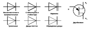 8. Емкость p-n-перех. Емкость p-n - перех образована так называемыми барьерной и диффуз. емкостями. Барьерная емк. Сб хар-ся сосредоточением по обе стороны границы раздела р и n слоев объемных зар-ядов, создаваемых ионами примес. Наличие бар. емк. обусл. протекание тока ч/з ЭДП при изм U на нем. Величина Сб опр-ся соотношением: Сб=dQ/dU. Вел-на Сб завис от площади р-n - перех и м/б до десятков и сотен пФ. Это физ. явл., т.е. зависимость Сб от Uобр исп. в варикапах, применяемых в качестве конденсаторов перем емк., управляемых U. Диффузионная емкость Сдиф обусл. изм. суммарных зарядов неравновесных е-ов и дырок, соотв-но в р и n обл в рез. изм. U на ЭДП. Эти заряды создаются за счет диффузии нос. ч/з ЭДП, поэтому Сдиф обр. при Uпр на нем. Величина Сдиф завис от протек ч/з перех Iпр и может составл сотни и тысячи пФ, т.е. Сдиф>>Сб Т.о. при прямом смещении ЭДП его емк. опр в основном Сдиф, а при обр., когда Сдиф=0 -барьерной емкостью Сб. | 9. Выпрямительные диоды и высокочастотные диоды. П/п. д., предназн для выпр перем. тока низк. частоты наз. выпрям. д. В них исп. асимметрия ВАХ р-n-перех. Выпр. д. по мощн подразд на: 1) малой (Iпр до 300 мА, Uобр до 1,2 кВ) 2) средней(Iпр=0,3…10А, Uобр=1,2кВ) 3) большой мощн. (Iпр до 1кА, Uобр до 3,5кВ). Параметрами выпр. д. явл-ся: 1) Допустимый выпр ток (средн знач-е прям-го тока), определ как допустимое среднее за период знач-е тока синусоидальной формы при работе цепи с част 50 Гц в заданном диапазоне температур. 2) Прямое падение U (Uпр на диоде при токе Iпр). 3) Max Uобр, классифицир при max раб t-ре. 4) Iобр, опр-ся при max раб t-ре и Uобр Кремниевые д. имеют по сравн с герм более высо- кую раб t-ру и Uобр, более низк цену и Iобр, но больш-ее прямое падение U. Схема замещ имеет 2 эл-та: Rn и rб. Высокочастотные диоды предн-ны для раб-ты в цепях с част. тока до сотен МГц, они подр-ся на: 1) Детекторные - исп-е для выдел-я низкочастотного сигнала из модулированного колебания. 2) Смесительные - предназн для изм. несущей частоты модулированного колебания. 3) Модуляторные – исп. для модуляции высокочастотных колебаний. Для изготовл всч. д. исп-ся спец. технологии позвол-е уменш. емкость д-да Cд. Параметрами этих диодов, кроме указ для выпрям диодов явл-ся предельная раб частота. Схема замещ: Rn, rб, Сд, Сб, Lв. |