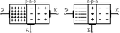 4. Полупроводники. П/п - в-ва, занимающие по величине уд. эл. проводимости промежуточное пол. м/у металлами и диэлектриками. Осн. признаками п/п явл. сильное влияние t, освещения, ионизирующих изл. и концентр. примес. на их эл. сопр. В качестве п/п исп. Ge, Si, GaAs. Для п/п хар. явл. то что сравн. небольшие энергетические воздействия (нагрев, облучение) приводят к увел. энергии электронов внешней оболочки атома и их отрыву от атомов. Такие e-ны обладают возможностью свободно перемещаться по объему п/п и наз. e-ми проводимости, при отрыве e-на от атома в месте разрыва появл. “дырка”. Отсутствие e-ны в вал. связи равносильно появл. в данном месте пол. заряда, который и предписываюд дырке. На незаполненную связь приходят валентные e-ны с соседней связи чему способствует тепловое движ. в п/п, поэтому место, где отсутствует валентный e-н хаотично перем-ся по кристаллу. Исчезновение дырок в одном месте и их появление в другом учитывают как движ. дырок. При приложении U к п/п дыр. будет двигаться в направлении противоп. напр. движ. e-на и опр. полярностью U что соотв. переносу пол. заряда, т.е. протеканию эл. тока. При производстве п/п приборов обычно исп. примесные п/п у которых часть атомов основного вещ. в узлах кр. реш. замещена атомами др. вещ. При исп. 5-вал. примесей 5 e-н ее атомов остается свободным от вал. связи и даже при комн. t-ре отрыв. от атома. Причем отдающие e-ны называют донорными, а п/п n-типа. В п/п с 3-х валентными примесями e-нов для заключения валентных связей не хватает. Они приходят от сосед. атомов в рез-те чего обр. дырки. Причем примесные валентные e-ны наз. акцепторными, а п/п р-типа. При отсутствии эл поля в крист. и одинаковой концентрации носителей заряда в объеме п/п e-ны и дыр. нах. в непрерывном тепл. хаотичном движ. и ток в п/п = 0. При прил. к п/п эл. поля или при неравн. распред. конц. носителей заряда в объеме п/п , возникает эл. ток. Напр. движение носителей заряда по действием эл. поля наз. дрейфом, а в рез-те возн. градиента концентрации носителей заряда - диффузией. | 5. Пробой p-n-перехода. Виды пробоев. При значит увел. Uобр возн-ет быстр рост Iобр(А). Это явл-е наз-ся пробоем ЭДП. Различают тепловой и эл. пробой, а эл. пробой разд. на лавинный и туннельный. Тепл. пробой возн. за счет интенсивн термогенер-ации носителей в p-n - перех при недопуст увел. t. Процесс развивается лавинообразно, т.к. увел. числа носителей заряда за счет увел. t вызывает рост Iобр и еще > разогрев участка ЭДП. Процесс заканчивается расплавлением этого участка и выходом прибора из строя (участок В-Г). Лав. проб. обусл. лав. размнож носителей в p-n - перех, в рез. ударн. ионизации атомов быстрыми нос. заряда под действием больш Uобр. Лав. проб. (участок А-Б) возн. в толстых p-n - перех где е-ны успевают разогнаться и в тоже время встретится с большим кол-м атомов. Туннельный проб. хар-ся отрывом вал. е-ов от атомов п/п под действ сильного эл. поля. Тун. проб. разв. в тонких p-n-перех, где при небольш Uобр имеет место высокая напряженность поля (участок А-В). Лав. и тунн. пробои явл-ся обратимыми процессами. |