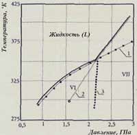 | Рис.1 Фазовая диаграмма воды и аппроксимационные кривые фазового равновесия: лед VI-вода (1) и лед VII-вода (2) и отклонение от фазовой границы VI - лед VII вблизи тройной точки (3). |