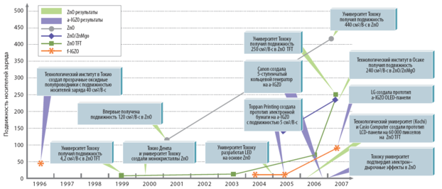 Оксиды, привлекающие повышенный интерес, могут быть разделены на две группы. Первая – оксид цинка (ZnO), и вторая – аморфные оксиды с содержанием тяжелых металлов типа аморфного InGaZnO4 (a-IGZO). Обе пропускают видимый свет и почти полностью прозрачны. Подвижность носителей (мера их скорости в данном электрическом поле) в материалах, сделанных на основе ZnO, составляет 250 см²/В∙с, что значительно выше достигаемой в LTPS – 100 см²/В∙с. Подвижности носителей у TFT, изготовленных из a-IGZO, лежат в пределах от 1 до 100 см²/В∙с, что также выше, чем максимум для аморфного кремния – 1 см²/В∙с. За последние несколько лет темп разработок ускорился, что связано с ростом подвижности носителей в ZnO (рис. 2), а изготовители активно создают приложения, основанные на a-IGZO. Устройство, продемонстрированное фирмой LG на симпозиуме E-MRS 2007, как раз и сделано на этих компонентах.