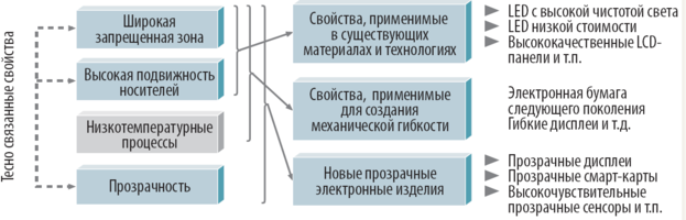 В то же время, по мнению профессора Хидео Хосоно (Hideo Hosono) из Лаборатории материалов и структур Токийского технологического института (Materials & Structures Lab, Tokyo Institute of Technology of Japan), прозрачная электроника «... не имеет достаточно большого поля непосредственных приложений, которые действительно используют прозрачность». Однако опытно-конструкторские работы активно ведутся даже без широкого диапазона целевых приложений, потому что ZnO и a-IGZO имеют и другие достоинства в дополнение к прозрачности (рис. 4). Разработчики также очень заинтересованы в таких свойствах, как большая ширина запрещенной зоны, что даст возможность создавать светодиоды с ультрафиолетовым излучением, белые светодиоды с высокой чистотой цвета и другие устройства; высокая подвижность носителей, которая могла бы привести к замене аморфного кремния, LTPS, и т. д., а также низкотемпературный процесс, который позволяет производить легкие гибкие изделия.