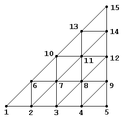 Применение метода конечных элементов, как показано на ряде примеров, приводит к системе алгебраических уравнений. Порядок системы уравнений совпадает с числом неизвестных узловых значений и может достигать сотен тысяч. Метод построения глобальной матрицы жесткости, рассмотренный в разделе 13.3, весьма неэффективен, если в таком виде пытаться реализовать его ЭВМ. Дело в том, что матрица жесткости отдельного конечного элемента [k(e)] (назовем ее локальной матрицей жесткости – ЛМ), имеет такое же число строк и столбцов, что и глобальная матрица жесткости (ГМ) [K], однако, большинство коэффициентов ЛМ равно нулю. Действительно, на рисунке 13.12 показана область, разбитая на 16 элементов и имеющая 15 узловых точек. Матрица жесткости для первого элемента этой области, показанная на рисунке 13.13, содержит 15 х 15 = 225 коэффициентов. Видно, что только девять из них - ненулевые, что составляет 4% от общего числа ячеек, занимаемых в ОЗУ матрицей ЛМ.