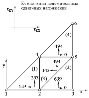 Полученные компоненты тензора напряжений схематически показаны на рисунке. 13.11. Внутри каждого конечного элемента сдвиговые напряжения постоянны, так как интерполяционные полиномы взяты линейными по Оx и Оy.