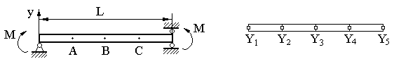 2. Обозначим искомую величину прогиба в точке i через Yi. Точки А, В и С разбивают стержень на 4 конечных одномерных симплекс – элемента , поэтому назначим узлы Y2 Y3 Y4 соответственно в точках А, В и С и узлы Y1 и Y5 – в крайних закрепленных точках стержня. Учитывая факт закрепления крайних точек, имеем нулевые перемещения в них под действием момента М, то есть: