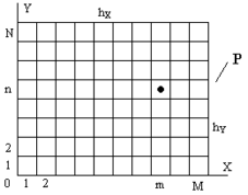 Рассмотрим двумерную функцию F(x,y), заданную в некоторой области Р. Разобьем область Р на дискреты ортогональной сеткой с шагом hX и hY по осям OX и OY соответственно. Пусть hX = hY =h. Пронумеруем дискреты по осям, начиная от начала координат. Обозначим через Fmn - значение функции в центре дискреты с номерами m и n соответственно по осям OX и OY (рисунок 1).