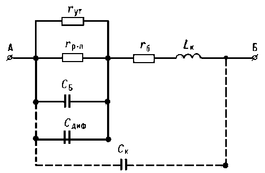 Полная эквивалентная схема диода, учитывающая электромагнитные поля, образующиеся при установке его в резонатор, может быть представлена в виде сложной электрической цепи с сосредоточенными L и С-элементами, которые зависят от типа и размеров резонатора и устройства крепления диода. Однако в сантиметровом диапазоне практически во всех случаях (независимо от типа резонатора) можно использовать приближенную эквивалентную схему, которая учитывает индуктивность вывода (соединительной проволочки и электродов) LnT, емкость керамической втулки между электродами Cpt и индуктивность Lp, обусловленную точками СВЧ, растекающимися по поверхности шляпки корпуса от контакта ее с резонатором.