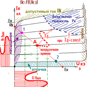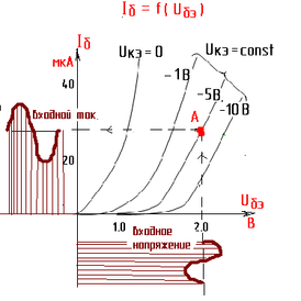 . Первые из них называются семейством входных, а вторые – семейством выходных характеристик. Их типичный вид приведен на рис. 3. Здесь же приведена построенная нагрузочная прямая по постоянному току и выбранная на ней рабочая точка транзистора А с координатами