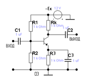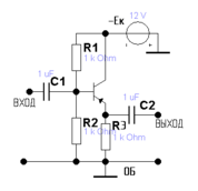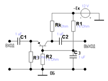 В схеме ОЭ конденсаторы С1 и С2 служат для связи каскада с источником сигнала и нагрузкой на переменном токе и исключают влияние источника и нагрузки на режим работы каскадов по постоянному току. Резисторы обеспечивают выбранный режим работы транзистора в активной области. С3 (блокировочный конденсатор) исключает из работы на переменном токе R3(ОЭ) или делитель напряжения R1,R2(ОБ), обеспечивая присоединение Э(Б) к общей точке схемы. На средних частотах можно не учитывать частотную зависимость коэффициента В и емкость СК. Емкости С1,С2,С3 выбираются настолько большими, что их сопротивлениями на средних частотах можно пренебречь.